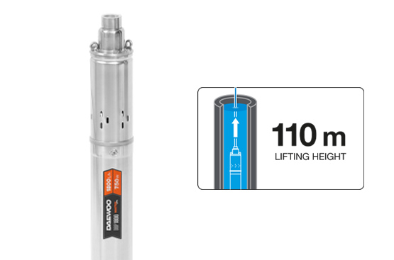 Насос способен подавать воду на впечатляющую высоту до 110 метров, обеспечивая эффективный подъем жидкости из глубоких скважин.